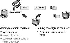 Workgroup adalah implementasi dari model jaringan peer to peer sedangkan domain adalah implementasi dari model client/server. Perbedaan antara workgroup dan domain kurang lebih sama dengan perbedaan antara jaringan peer to peer – client/server.